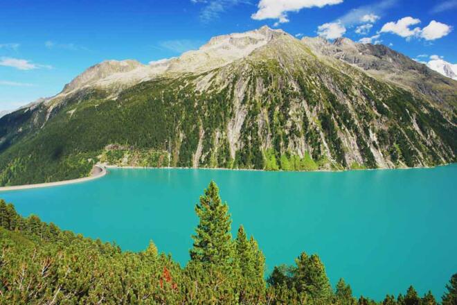 Der Tag, an dem der Alpenhauptkamm überschritten wird. Von Mayrhofen läßt man sich per Linienbus zum Schlegeis Stausee auf 1.800 Meter Seehöhe chauffieren. Schon hier hat man einen Traumblick über den hellblauen See und zu den mächtigen dahinterliegenden Gletschern. Der Anstieg zum Pfitscherjoch führt über einen komfortablen Steig vorbei an Wasserfällen und entlang des mäandrierenden Bachs. Kurz nach der italienischen Grenze liegt das Pfitscherjochhaus, mit 2.275 Meter der höchste Punkt des Tages. Über sanfte Almwiesen und einen Mischwald wandert man hinab zum Talboden des Pfitschtals. Auf einem leicht erhöhten Wiesenweg erreicht man das Tagesziel St. Jakob oder Platz.
